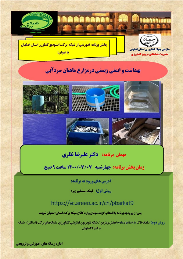 عنوان برنامه: بهداشت و ایمنی در ماهیان سرد آبی چهارشنبه 7 مهر ماه 1400 ساعت پخش 9 صبح از استودیو کشاورز استان اصفهان
