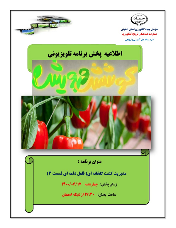 عنوان برنامه: مدیرت کشت گلخانه ای ( فلفل دلمه ای قسمت 3 ) چهارشنبه 17 شهریور ماه 1400 ساعت پخش 17:30 از شبکه اصفهان