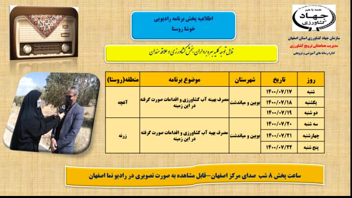 عنوان برنامه: مصرف بهینه آب کشاورزی از شنبه 17 مهر ماه 1400 لغایت پنجشنبه 22 مهر ماه 1400ساعت پخش 8 شب صدای مرکز اصفهان