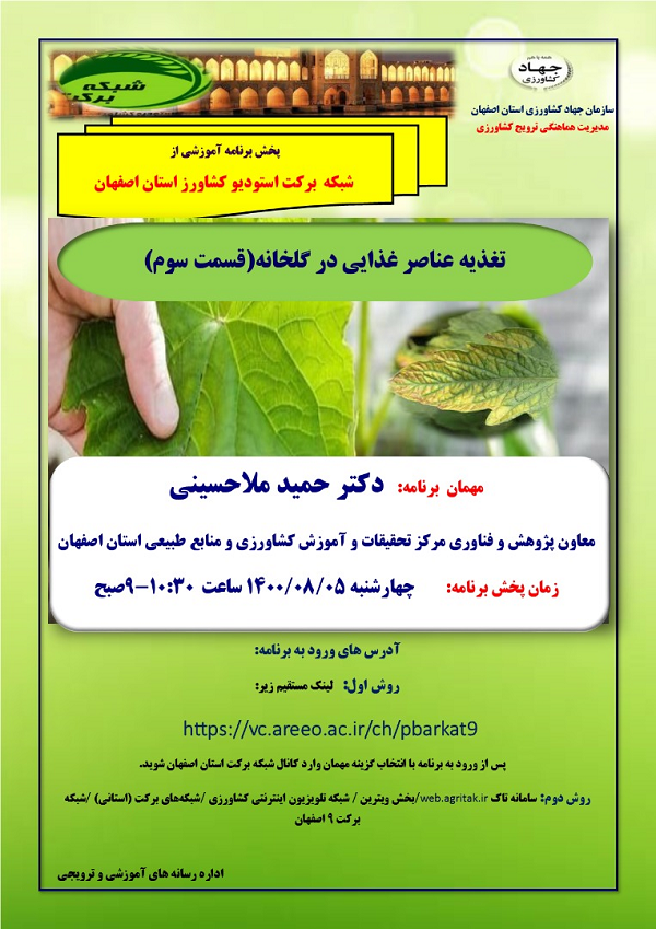عنوان برنامه: تغذیه عناصر غذایی در گلخانه ( قسمت سوم ) چهارشنبه 5 آبان ماه 1400 ساعت پخش 10:30-9 صبح از استودیو کشاورز استان اصفهان