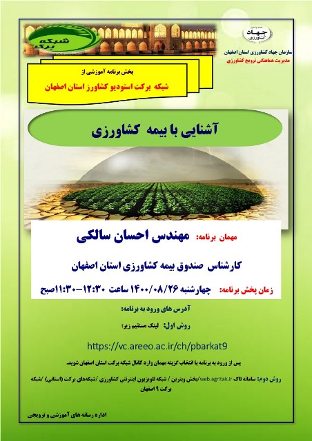 عنوان برنامه: آشنایی با بیمه محصولات کشاورزی چهارشنبه 26 آبان ماه 1400 ساعت پخش 12:30- 11:30 صبح از استودیو کشاورز استان اصفهان