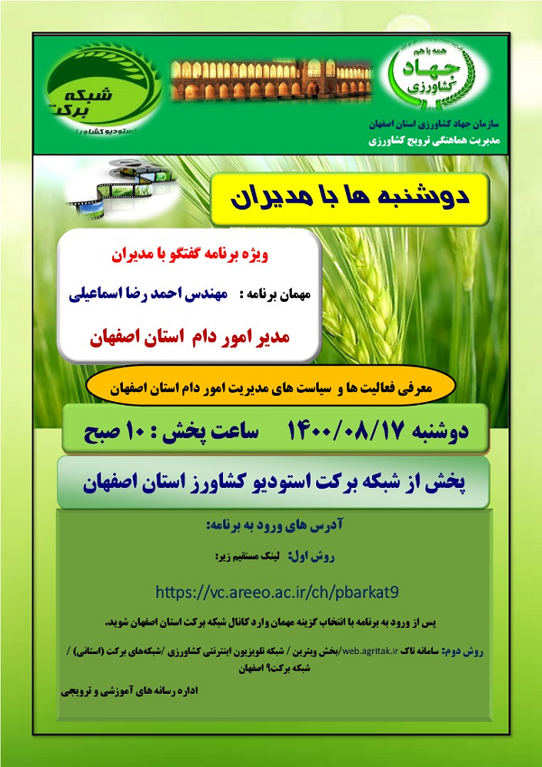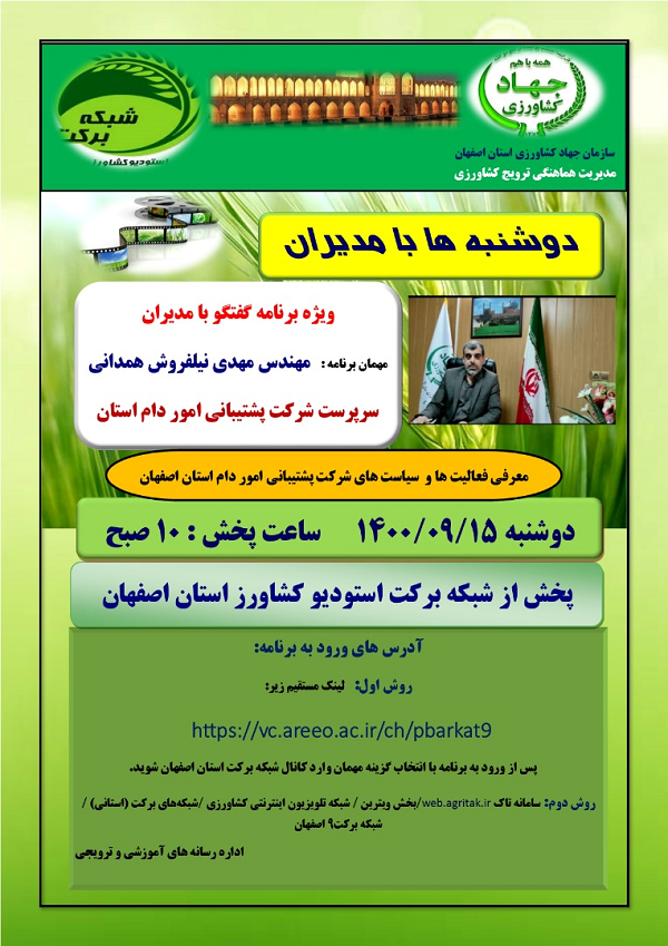 عنوان برنامه: گفتگو با مدیر امور دام استان اصفهان دوشنبه 17 آبان ماه 1400 ساعت پخش 10:15- 9 صبح از استودیو کشاورز استان اصفهان