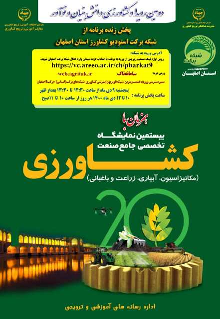 پخش زنده "دومین رویداد کشاورزی دانش بنیان و نوآور" از شبکه برکت استودیو کشاورز استان اصفهان همزمان با بیستمین نمایشگاه تخصصی جامع صنعت کشاورزی. پنج شنبه ۹ دی ماه ساعت ۱۲:۳۰تا ۱۳:۳۰ و ۱۰ تا ۱۲ دی ماه هر روز از ساعت ۱۰تا ۱۱صبح