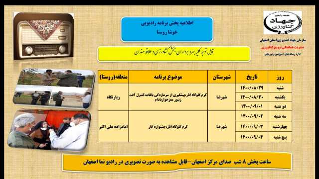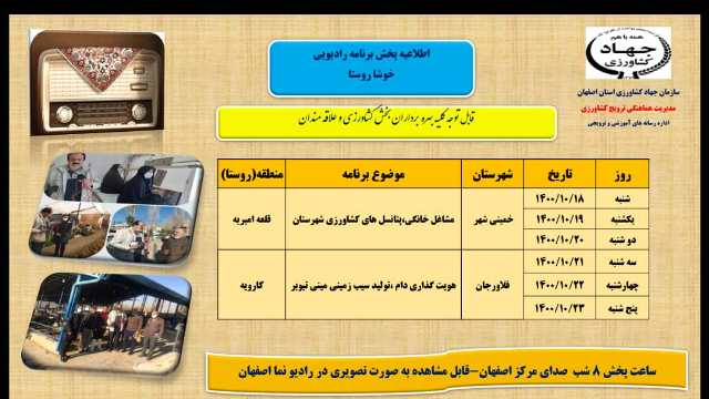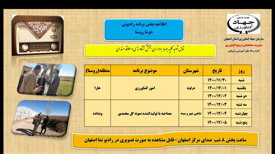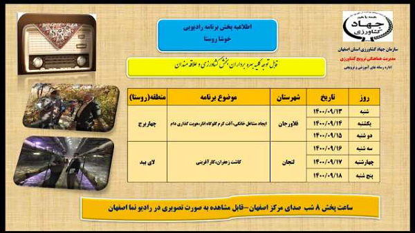 عنوان برنامه: ایجاد مشاغل خانگی ،کرم گلوگاه انار، هویت گذاری دام ، کانون جوانان روستایی، آفات و بیماری در گلخانه از شنبه 20 آذر ماه 1400 لغایت پنجشنبه 25 آذر ماه 1400 ساعت پخش 8 شب صدای مرکز اصفهان