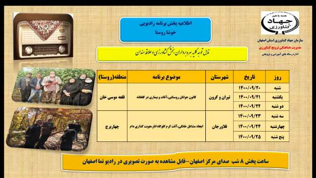 اطلاعیه پخش برنامه رادیویی خوشا روستا- از شنبه 29 آبان ماه 1400 لغایت پنجشنبه 4 آذر ماه 1400