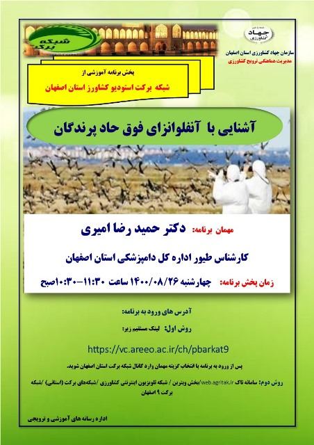 عنوان برنامه: آشنایی با آنفلوانزای فوق حاد پرندگان چهارشنبه 26 آبان ماه 1400 ساعت پخش 11:30- 10:30 صبح از استودیو کشاورز استان اصفهان