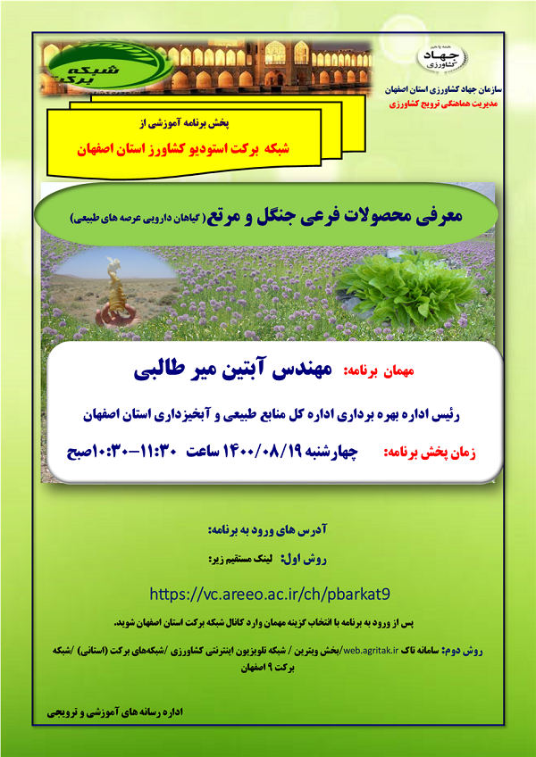 عنوان برنامه: معرفی محصولات فرعی جنگل و مرتع ( گیاهان دارویی عرصه های طبیعی ) چهارشنبه 19 آبان ماه 1400 ساعت پخش 11:30-10:30 صبح از استودیو کشاورز استان اصفهان