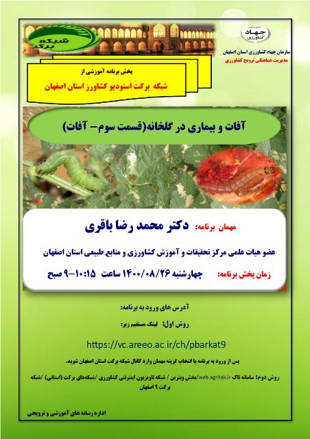 عنوان برنامه: آفات و بیماری در گلخانه ( قسمت سوم- آفات ) چهارشنبه 26 آبان ماه 1400 ساعت پخش 10:30- 9 صبح از استودیو کشاورز استان اصفهان