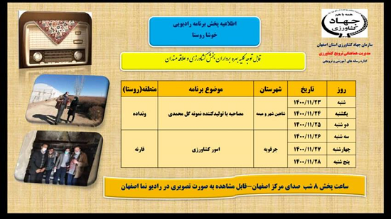 عنوان برنامه: مصاحبه با تولید کننده نمونه گل محمدی و امور کشاورزی شنبه تا پنجشنبه ۳۰ بهمن لغایت ۵ اسفند ماه ساعت ۸ شب صدای مرکز اصفهان